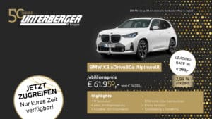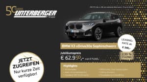 Zum 50-jährigen Jubiläum von BMW Unterberger feiern wir ein halbes Jahrhundert Fahrfreude mit streng limitierten Sondermodellen, attraktiven Ausstattungspaketen und exklusiven Vorteilen. Die 50 Jahre Sondermodelle von BMW Unterberger verbinden sportliches Design, modernste Technologie und elektrifizierte Antriebe – und sind nur in begrenzter Stückzahl verfügbar. Jetzt ist der perfekte Zeitpunkt, sich eines dieser begehrten Jubiläumsmodelle zu sichern.