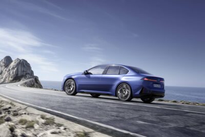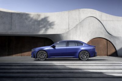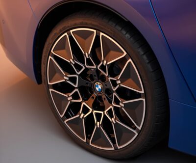 Die elektrische Limousine interpretiert das klassische 3er-Design neu. Die Proportionen mit langem Radstand und kurzen Überhängen bleiben erhalten, werden aber durch klare Flächen und eine reduzierte Linienführung modernisiert. Die Front wird durch eine neu gestaltete BMW Niere und die Doppelscheinwerfer als durchgehende Lichtsignatur geprägt, die dem Fahrzeug ein futuristisches Gesicht verleihen.